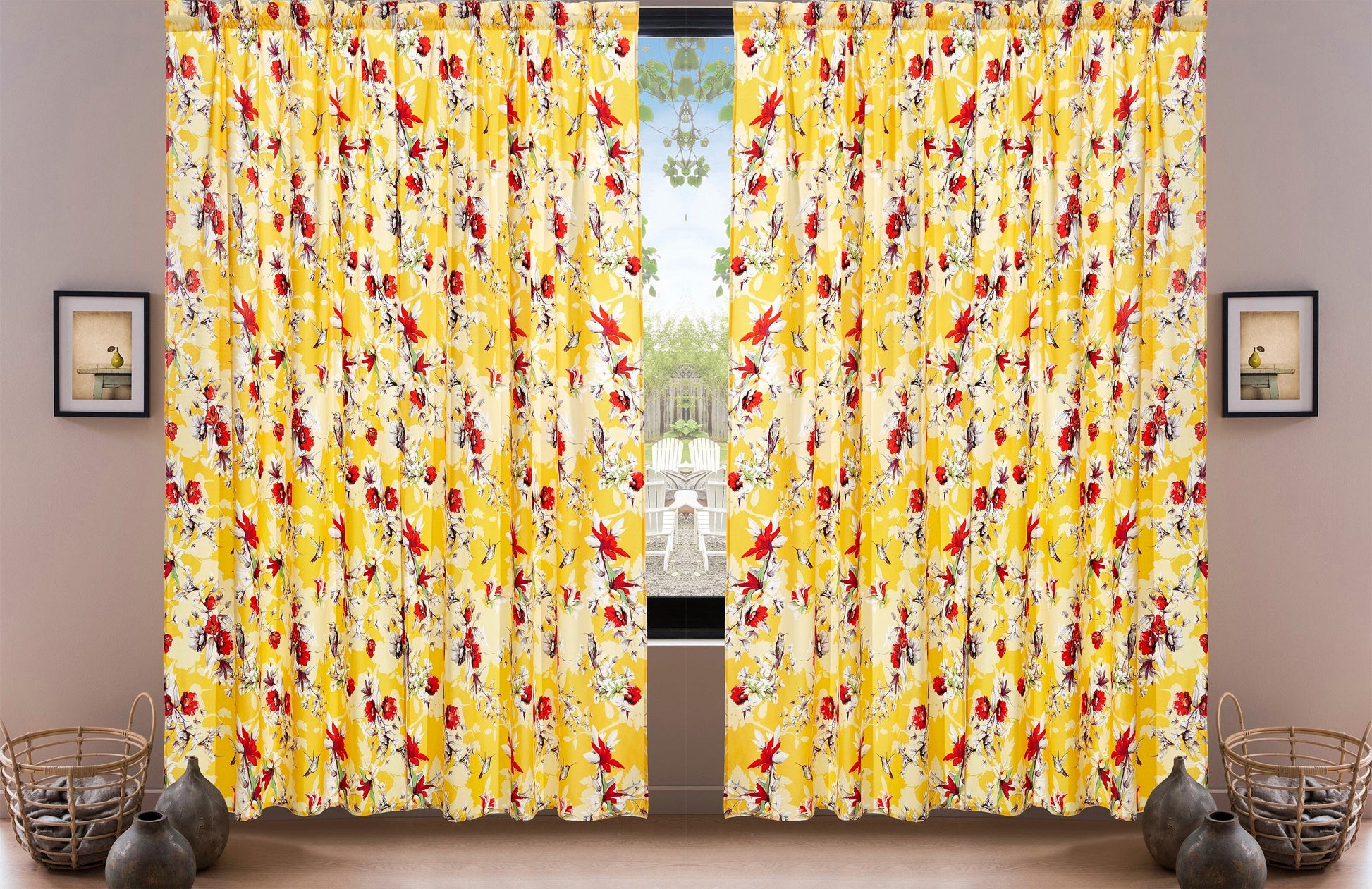 Set of 2 Yellow Semi Sheer Curtain Panels that are accented with floral hummingbird patterns with hints of red, grey, green, and a vibrant yellow shades.