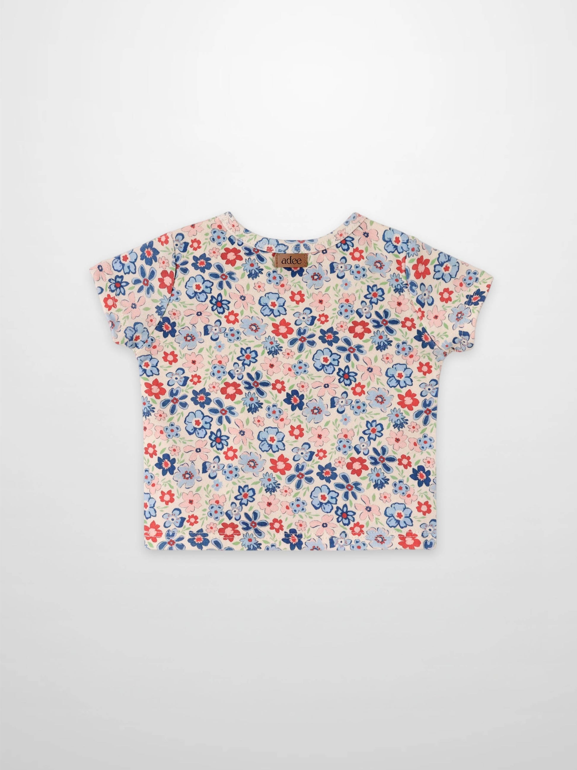 Meet the Garden Flower short-sleeve T-shirt, a bright and playful top designed for toddlers and little girls. The all-over floral print adds a cheerful touch to any everyday outfit. It is perfect for camp days, weekend adventures, and family outings. With a comfortable fit and kid-friendly style, this tee invites easy dressing and joyful color.